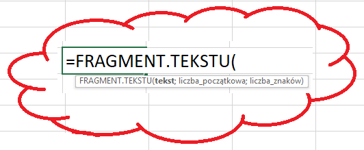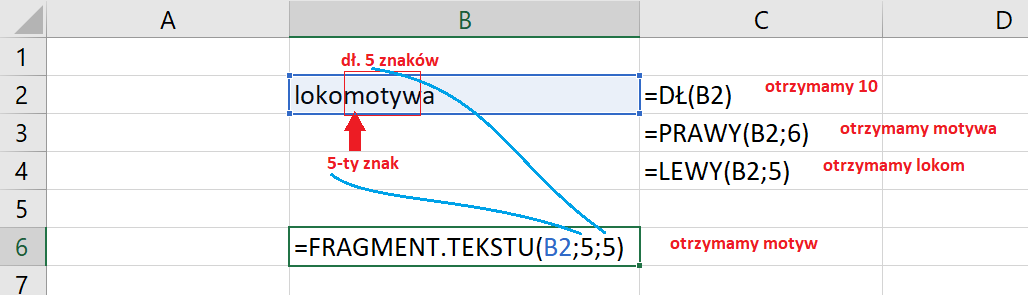 Ta komenda potrzebuje już trzech parametrów. Pierwszym, podobnie jak we wszystkich poprzednich funkcjach, będzie tekst lub adres komórki zawierającej tekst. Drugim parametrem będzie znak, kod którego planujemy kopiować nasz tekst (znaki w wyrazie liczymy od 1). Ostatnim parametrem będzie liczba kopiowanych znaków (uwaga NIE liczba określająca pozycję znaku ostatnego). Poniżej przykład dla wszystkich omówionych wyżej komend.