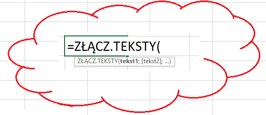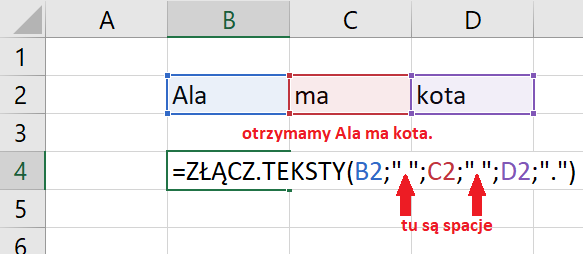 Komenda ta nie jest ograniczona ilością parametrów. Wprowadzamy do niej tekst lub adresy komórek zawierające tekst, które chcemy połączyć. Poszczególne częsci tekstu oddzielamy znakiem średnika. Można też dodać znak odstępu. Wówczas należy pamiętać aby dodać go w cudzysłowie. Tak jak pokazano na poniższym przykładzie.