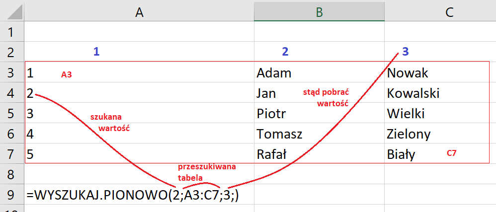 Chcąc wyszukać nazwisko osoby będącej na którejś pozycji w tabeli postępujemy wg pewnego schematu. Po pierwsze określamy całą tabelę, która zawiera dane znane (te których szukamy) oraz dane których będziemy poszukiwać. W naszym przypadku zaznaczamy całą tabelę począwszy od komórki A3 do C7. Należy pamiętać o tym, aby wartości znane były w pierwszej kolumnie tabeli.