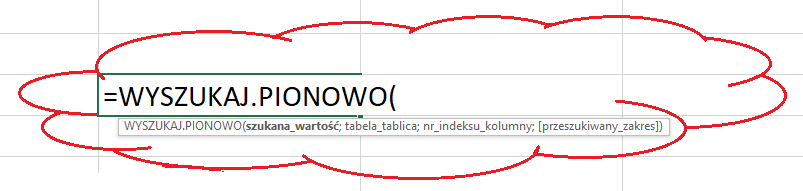 Mając określonę tabelę możemy wprowadzić wartości do komendy WYSZUKAJ.PIONOWO. Pierwszym parametrem jest pozycja, której szukamy (będzie ona szukana w pierwszej z lewej kolumnie naszej tabeli). Drugim parametrem jest cały zakres tabeli. Trzeciem z kolei jest nr kolumny, z której wartości mają być pobrane. Ustalając nr kolumny, przyjmujemy że pierwsza kolumna z lewej strony tabeli ma numer 1. Czwarty parametr jest opjonalny (nie trzeba go wybrać). Bez względu na to czy go wskażemy czy nie, musimy trzeci parametr zakończyć znakiem średnika.