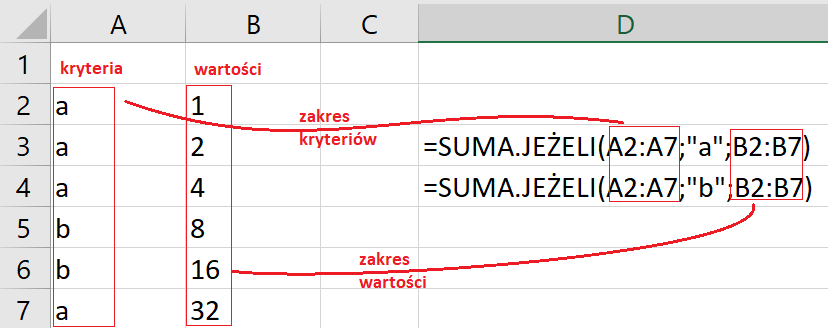 W przykładzie sumujemy wszystkie wartości, które w kolumnie z lewej posiadają określoną literę, a lub b. Ważne, aby podać dwa zakresy komórek. Jeden, to zakres zawierający kryteria, drugi zawierający wartości. Pozostały parametr, decydujący które komórki będziemy sumować znajduje się pomiędzy tymi zakresami.