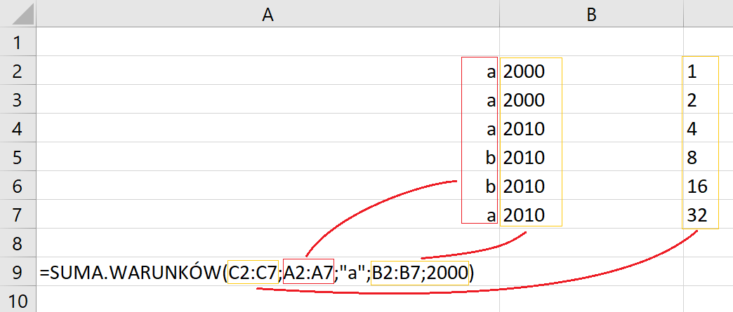 Suma warunków jest rozszerzeniem komendy suma jeżeli. W odróżnieniu do poprzedniej funkcji tutaj możemy wprowadzić kilka warunków. W przykładzie poniżej podano dwa warunki. Zliczamy wartości, które są w tych samych wierszach, co literka "a" oraz wartość 2000.