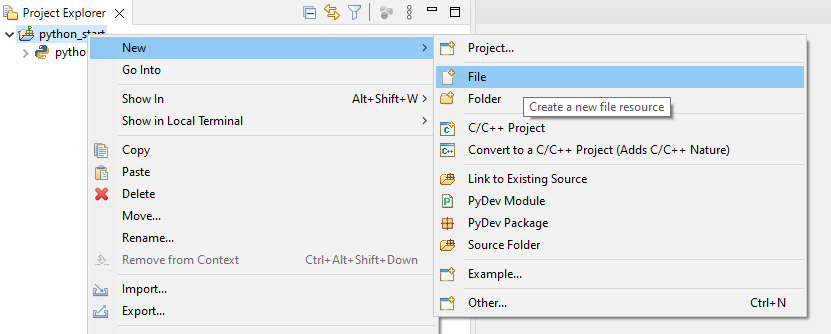 W naszym projekcie tworzymy plik z codem. Prawym przyciskiem myszy klikamy na naszym projekcie i wybieramy New -> File.