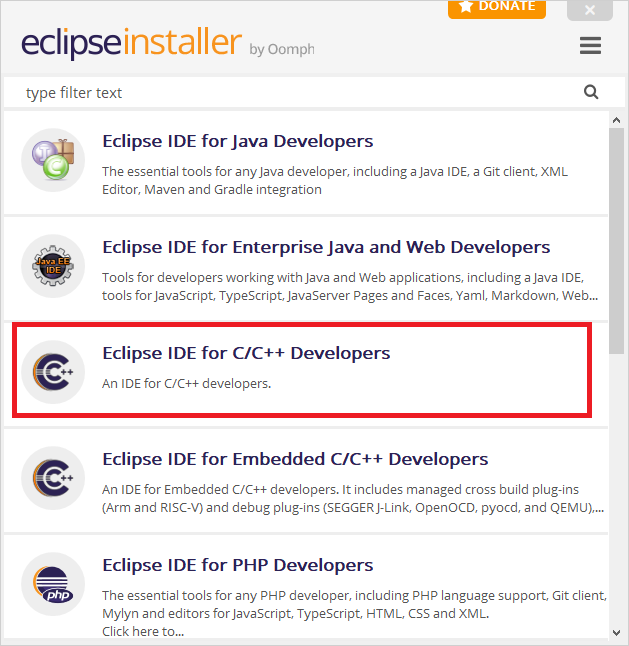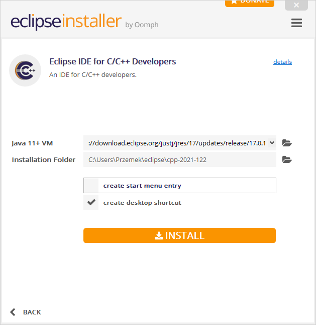 Instalujemy program Eclipse. Podczas instalacji wybieramy w czym będziemy pracować. Możemy wybrać język C/C++. Pythona doinstalujemy w kolejnych krokach.