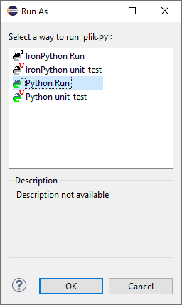 Następnie wybieramy Python Run oraz klikamy OK