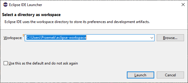 Uruchamiamy Eclipse zatwierdzając proponowane lokalizacje plików.