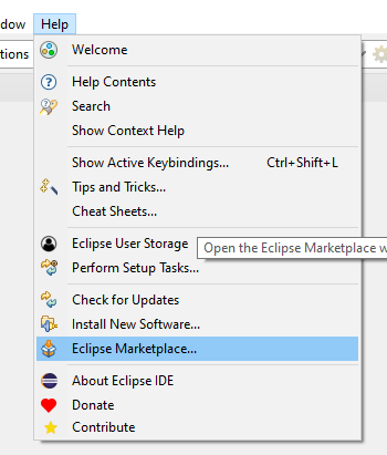 Instalujemy Pythona dla Eclipse. W tym celu wybieramy Help -> Eclipse Marketplace...