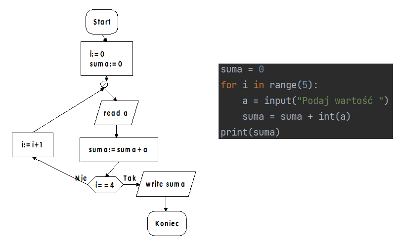 tutajProgram prosi o wprowadzenie 5 liczb i zwraca (wyświetla) ich sumę.